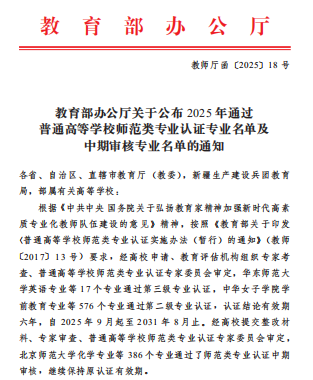 近日,教育部办公厅发布了《2025年通过普通高等学校师范类专业认证专业名单及中期审核专业名单的通知》(教师厅函〔2025〕18号),我校小学教育、英语和数学与应用数学3个专业通过教育部师范类专业第二级认证,认证结论有效期六年,自2025年9月起至2031年8月止。同时,生物科学专业通过中期审核,继续保持原认证有效期至2028年6月。至此,学校13个师范类专业中,7个专业通过认证,6个专业进入自评阶段,进入认证环节师范专业比例已达100%...