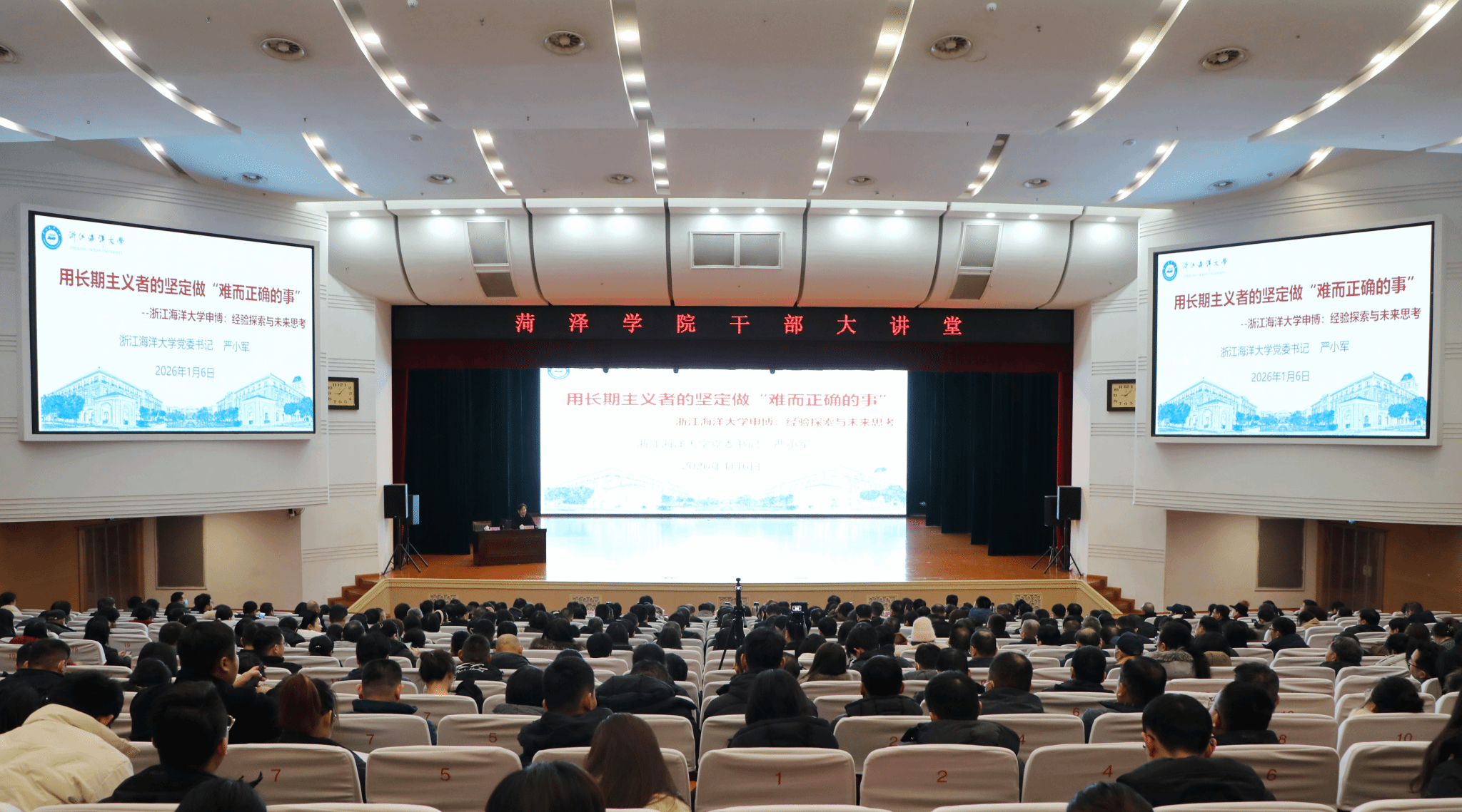 1月6日上午,我校在艺术中心演播厅举办干部大讲堂,特邀浙江海洋大学党委书记严小军教授来校指导并作专题报告。校党委书记黄富峰主持会议,全校副科级以上干部及教师代表600余人到场聆听。报告会上,严小军教授以《用长期主义者的坚定做难而正确的事——浙江海洋大学申博经验探索与未来思考》为主题,围绕问道海大、心得凝练、迈向未来三大维度,系统阐述了浙江海洋大学在申博工作中的宝贵实践经验。他深入剖析了申博初期面临的高指标与弱基础、...