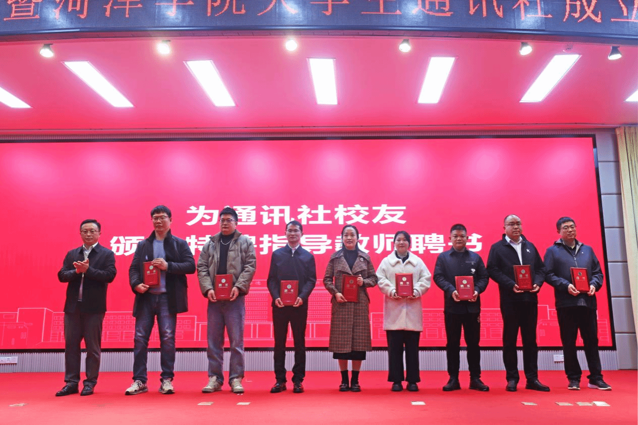 活动中,赵晓龙为大学生通讯社校友代表颁发指导教师聘书,宣传部副部长柳杨为在校大学生通讯社、广播台成员颁发“优秀记者”荣誉证书。
