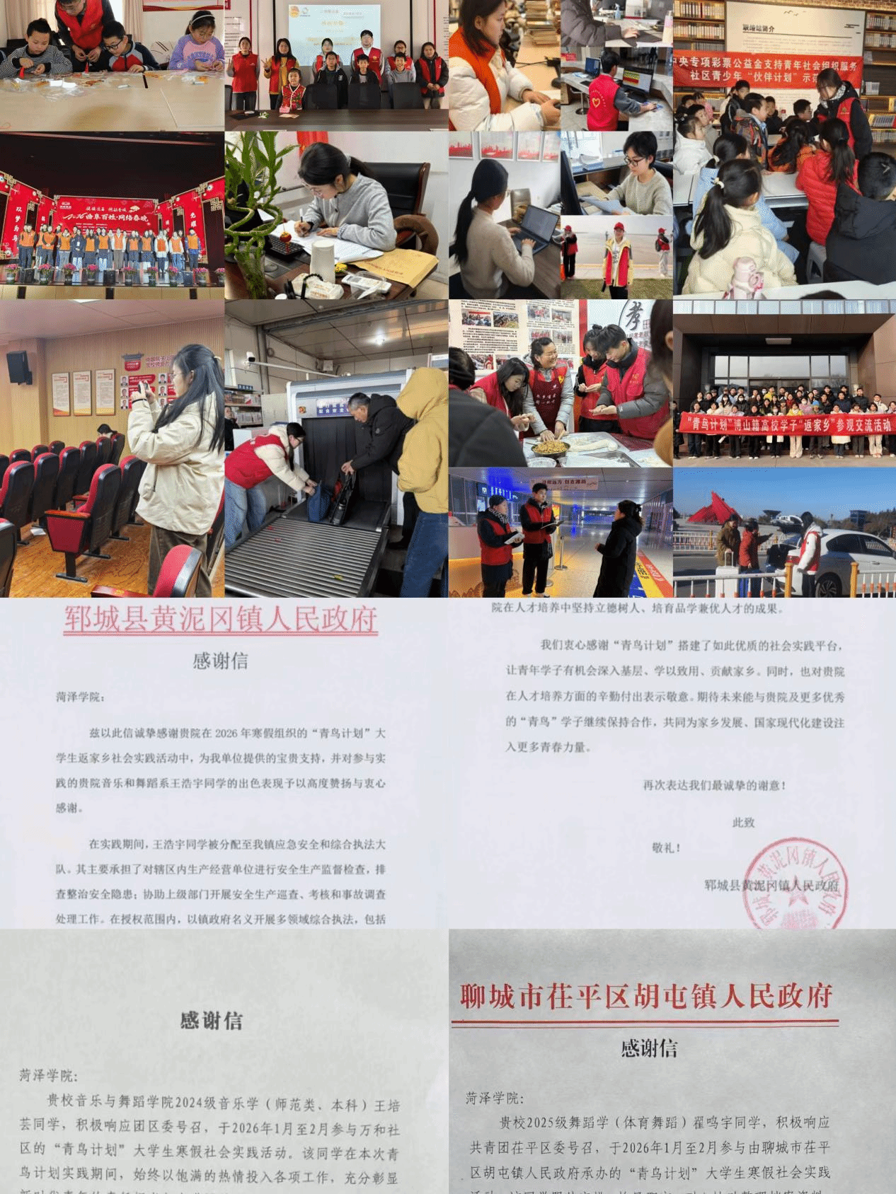 化学化工学院学子主动对接乡镇、村(社区),开展政务实践、档案整理、政策宣传和群众接待等工作,积极参与留守儿童陪伴等公益志愿服务,并将民情民意整理形成调研报告,为基层治理提供有力参考。人文与新闻传播学院学子深入区政府机关、图书馆、汽车站、高铁站等一线场所开展实践活动,足迹遍布潍坊、滨州、菏泽、莱阳、日照等地,协助文件整理、信息录入与政策宣传,开展志愿服务活动,用耐心与细致服务群众。外国语学院学子深入社区街道、政府机关、交通管理等一线单位,足迹辐射聊城、烟台、曲阜、菏泽、临沂等地,将课堂所学转化为实践本领,用实际行动践行初心使命,彰显青年担当。商学院学子深入政府机关、社区街道、国企等单位,开展留守儿童伴学、金融反诈宣传、基层金融服务等工作,践行青年担当。音乐与舞蹈学院20名学子深入菏泽、泰安、日照、淄博等地政府机关、社区街道,扎实做好社区服务、留守儿童辅导等工作,用专业反哺家乡,为孩子们带去歌声与欢笑。美术与设计学院学子深入威海、济宁、德州、菏泽、滨州、临沂等地开展社会实践,立足专业特长,在基层岗位上践行青春担当。