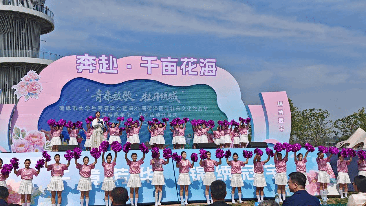 4月12日上午,第35届菏泽国际牡丹文化旅游节“青春放歌·牡丹倾城”菏泽市大学生青春歌会暨“青春嘉年华”系列活动开幕式在菏泽冠宇牡丹园举办。我校党委委员、副校长曲相艳出席活动并致辞,校团委全体人员、参演学生和指导教师、学生志愿者200余人参加活动。
