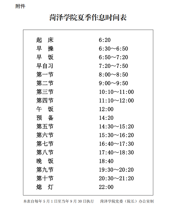 附件:菏泽学院夏季作息时间表