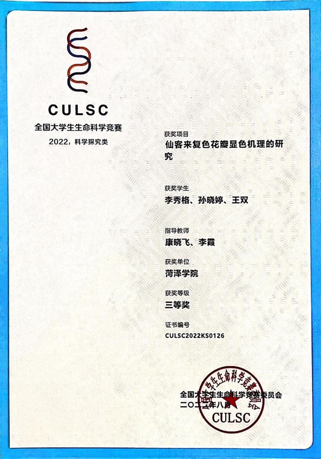 近日,2022年全国大学生生命科学竞赛(CUSLC)决赛获奖名单揭晓,我校农业与生物工程学院教师康晓飞、李霞指导,李秀格、孙晓婷、王双同学共同完成的项目《仙客来复色花瓣显色机理的研究》夺得科学研究类国家级三等奖。