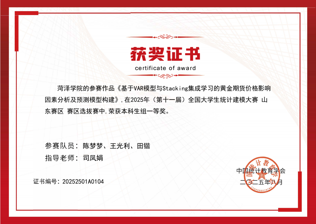 近日,由中国统计教育学会主办的2025年全国大学生统计建模大赛举行。数学与统计学院统计建模团队获得国家级二等奖1项,省级一等奖2项、二等奖3项、三等奖2项。