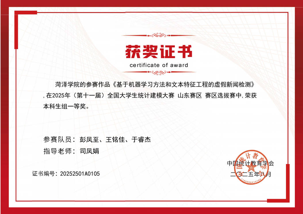 成绩的取得,充分展现了数学与统计学院“以赛促教、以赛促学、以赛促创”的人才培养成效,也体现了学生扎实的数据分析能力、统计建模技能与时代热点洞察力。数学与统计学院将以此为契机,持续深化创新实践与人才培养全过程的深度融合,依托高水平竞赛平台,推动学科建设与人才培养质量协同提质,为国家输送更多能够引领未来的高素质统计专业人才。