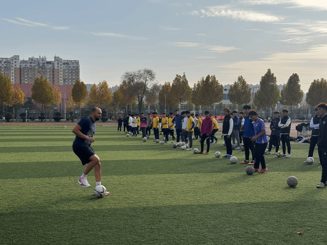 艾伦教授为同学们讲解并演示足球的技术动作,引导同学们进行实践操作。在同学们练习的过程中,艾伦教授细致观察,并及时进行一对一指导,帮助同学们掌握技术要领。