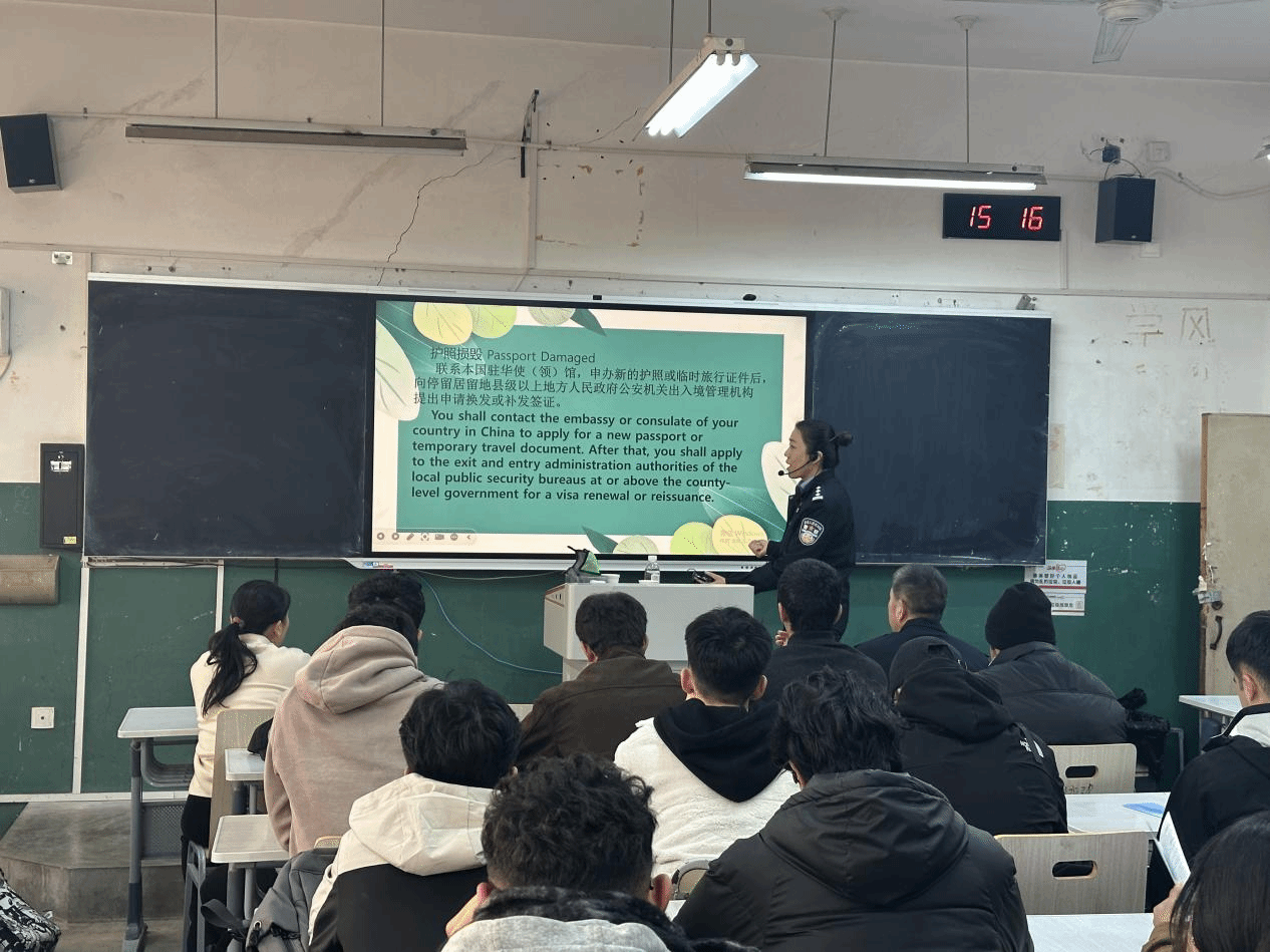 为进一步增强我校国际学生的法律意识与安全防范能力,营造安全、和谐的校园环境,近日,国际交流学院邀请菏泽市公安局出入境管理支队来校,为全体国际学生举办了一场内容丰富、实用性强的安全知识讲座。