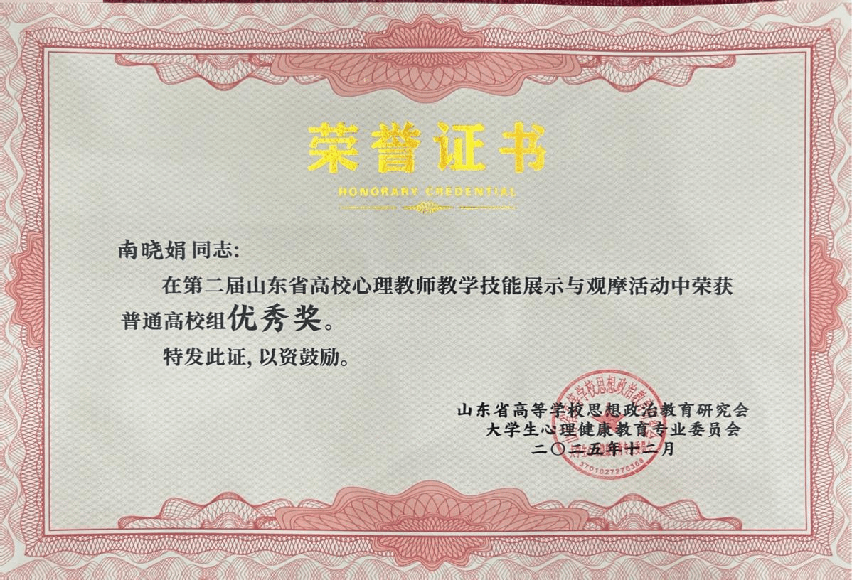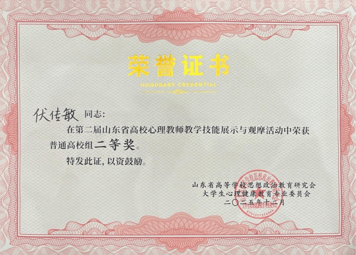 近日,由山东省高等学校思想政治教育研究会大学生心理健康教育专委会主办的第二届山东省高校心理教师教学技能展示与观摩活动在山东理工大学举行。我校机电工程学院辅导员伏传敏荣获普通高校组二等奖,教师教育学院辅导员南晓娟荣获普通高校组优秀奖。
