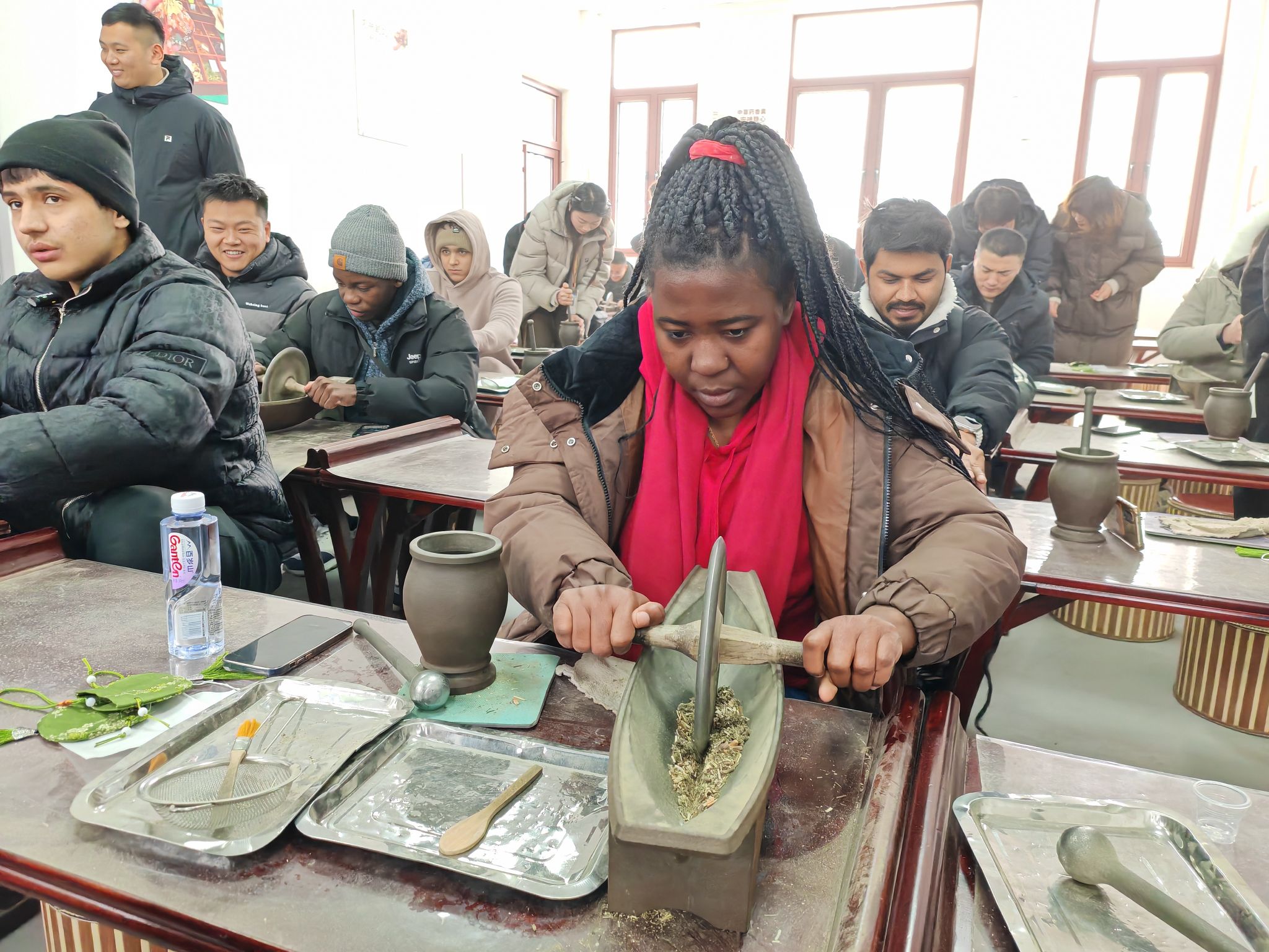 在香囊制作环节,国际学生围坐在一起,在老师的指导下,将艾草、薄荷等天然草药研磨后装入精致的布袋中。在东明粮画的创作中,国际学生了解到东明粮画是一种以五谷杂粮为原料,通过粘、贴、拼等方式创作的艺术形式,展现了农耕文化的智慧与美感,在老师的耐心讲解下,学会了如何将不同颜色的谷物巧妙组合,绘制出富有创意的图案。