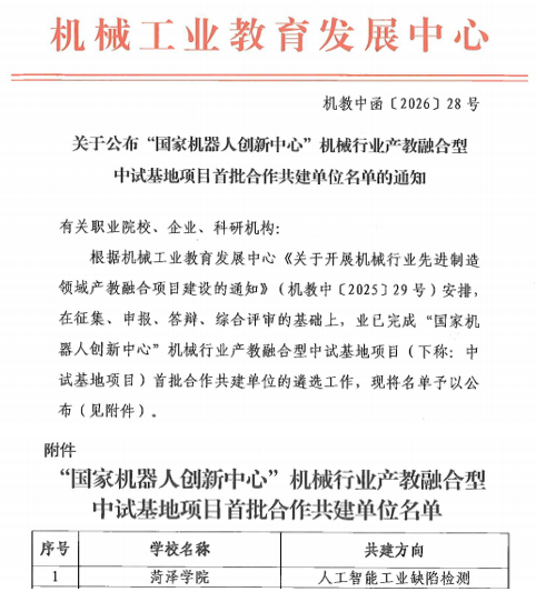 近日,机械工业教育发展中心正式发布“国家机器人创新中心”机械行业产教融合型中试基地项目首批合作共建单位名单。我校机电工程学院成功入选,并承担“人工智能工业缺陷检测”方向的建设任务,标志着学院在深化产教融合、对接国家高端制造战略方面取得的又一重要突破。