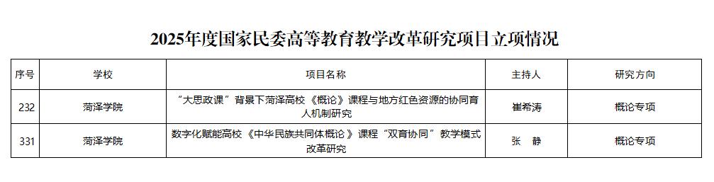 近日,2025年度国家民族事务委员会高等教育教学改革研究项目立项名单正式公布。我校菏泽市统战理论研究基地副秘书长、马克思主义学院教师崔希涛申报课题《“大思政课”背景下菏泽高校<概论>课程与地方红色资源的协同育人机制研究》、教师张静申报课题《数字化赋能高校<中华民族共同体概论>课程“双育协同”教学模式改革研究》获批立项。